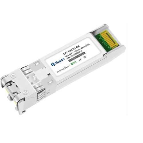 El SFP+ ER 1550 nm 40 Km SM 10 Gb/s transceiver es un módulo de alto rendimiento que soporta una doble velocidad de datos de 10 Gbit /s para Giga Ethernet. Tiene una distancia de transmisión de 40 km en la λ de 1550 nm y SM. Para conector LC duplex. Es compatible con las especificaciones eléctricas de SF. Se pueden intercambiar en caliente.